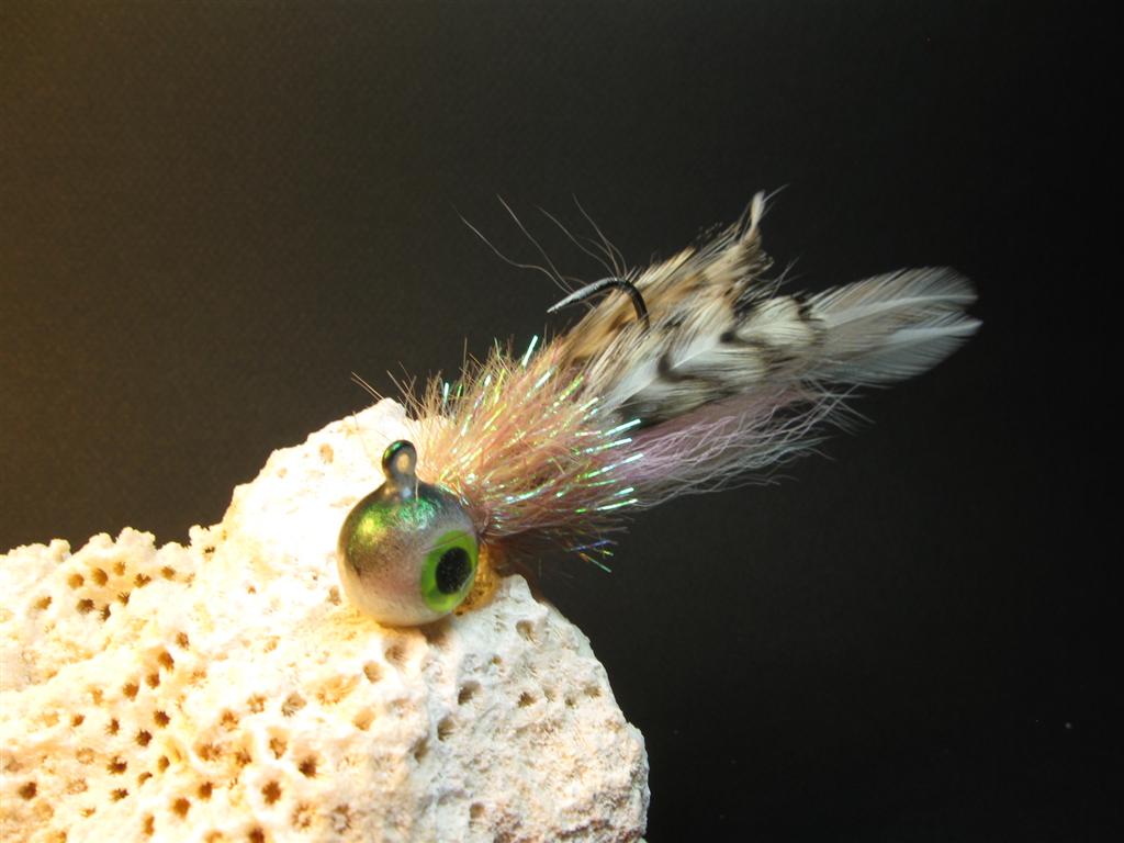 The Jays This jig is my universal go-to lure. I tied The Jays to imitate tinker mackeral for striped bass. I've found that by tinkering with the colors I can target the tie for better success with other species. In the clear tropic waters the tarpon snook and permit go more for the earth tone colors like greys and tans. I've probably tied a hundred different patterns but I'll put a short list of my favorites. They're tied on Mustad back nickel hooks. I use feathers from whole saddles and necks and the perfect tecture and size bucktail. The large 3-D eyes, collars and hand painted heads are coated with a flexable epoxy that resists chipping. The most common sizes are 3⁄8, 1⁄2, 5⁄8, and 3⁄4 ounce with other sizes available. The Green and Blue Jays These are the perfect imitation of many juvenile tuna species. The northeast stripers go nuts for them, especially in very clear water when other artificials won't work. They really shine when used on the offshore species. Mahi-Mahi rarely turn them down. I've caught many dolphin, including a 44lb dolphin on 6 pound test, using these jays. I've tested these in saltwater up and down the east coast and it has duped a variety of species. The Natural Jays The Natural Jays are one of my favorite bucktails for the clear waters of the florida keys. Most of the inshore gamefish there love these jigs, I kill when I target tarpon,snook or permit. The Permit go nuts when these jigs are tied with a root beer flash collar. The Orange Jay This is another color that has found it's own special area of use, This color jay really does well in the stained waters of florida bay, especially around Flamingo. It is also an excellent peacock bass lure in the smaller sizes. Grouper and Snapper also show a strong preference for this color. |